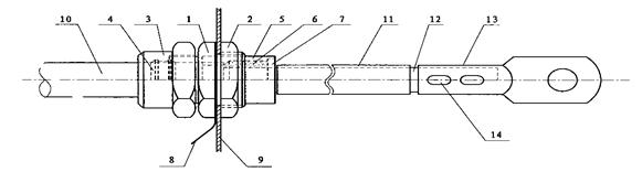 1.封套本體 2.束緊螺母 3. 封套螺母4壓縮環(huán) 5.密封罐 6.密封料 7.罐蓋 8.接地銅片 9.支架或殼體 10. 礦物絕緣電纜 11.熱縮管 12電纜芯線 13.壓接型接線端子 14.壓接坑